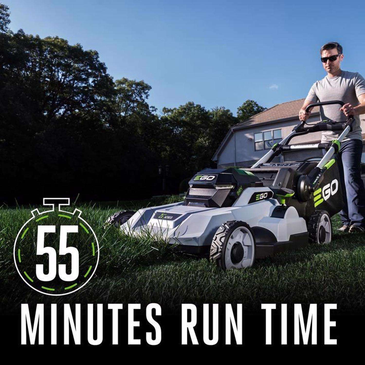 The EGO POWER+ 21″ Mower delivers up to 6.0 foot-pounds of torque – power that exceeds gas without the noise, fuss, or fumes. The high-efficiency brushless motor delivers long runtimes, low vibration, and lifelong durability. This electric lawn mower delivers up to 55 minutes of run time on a single charge with the recommended 56V 6.0Ah ARC Lithium battery (available separately). The cordless lawn mower delivers precision cutting with its advanced mulching blade and seven cutting height positions from 1.25 to 4 inches, adjustable with one hand. Three-in-one functionality delivers your choice of mulching, side discharge, or bagging your grass clippings; an easy-access two-bushel grass collection bag is included. This push lawn mower includes bright LED lights for added visibility when mowing at dawn or dusk, and it folds flat for compact storage between cuts. Experience Power Beyond Belief with the EGO POWER+ 21″ Lawn Mower. *
