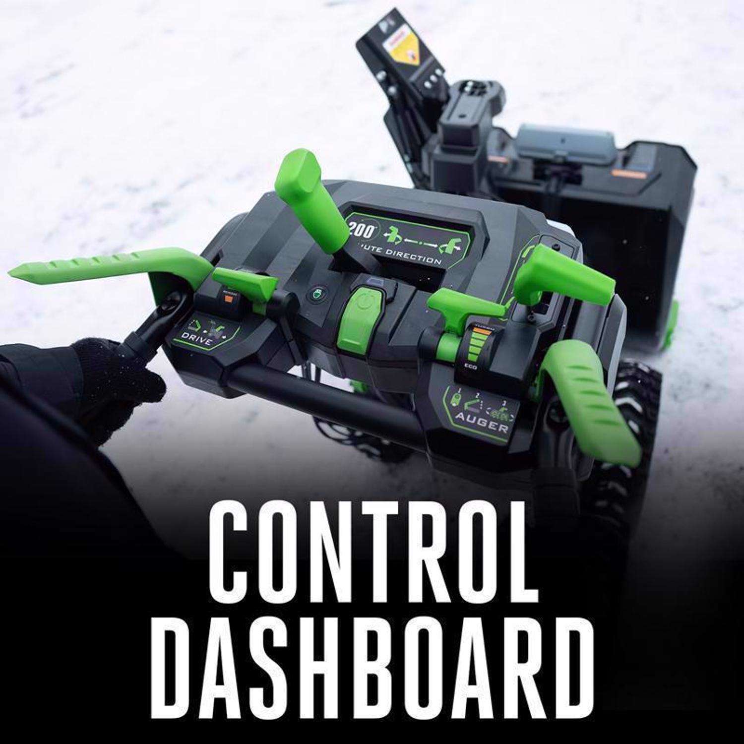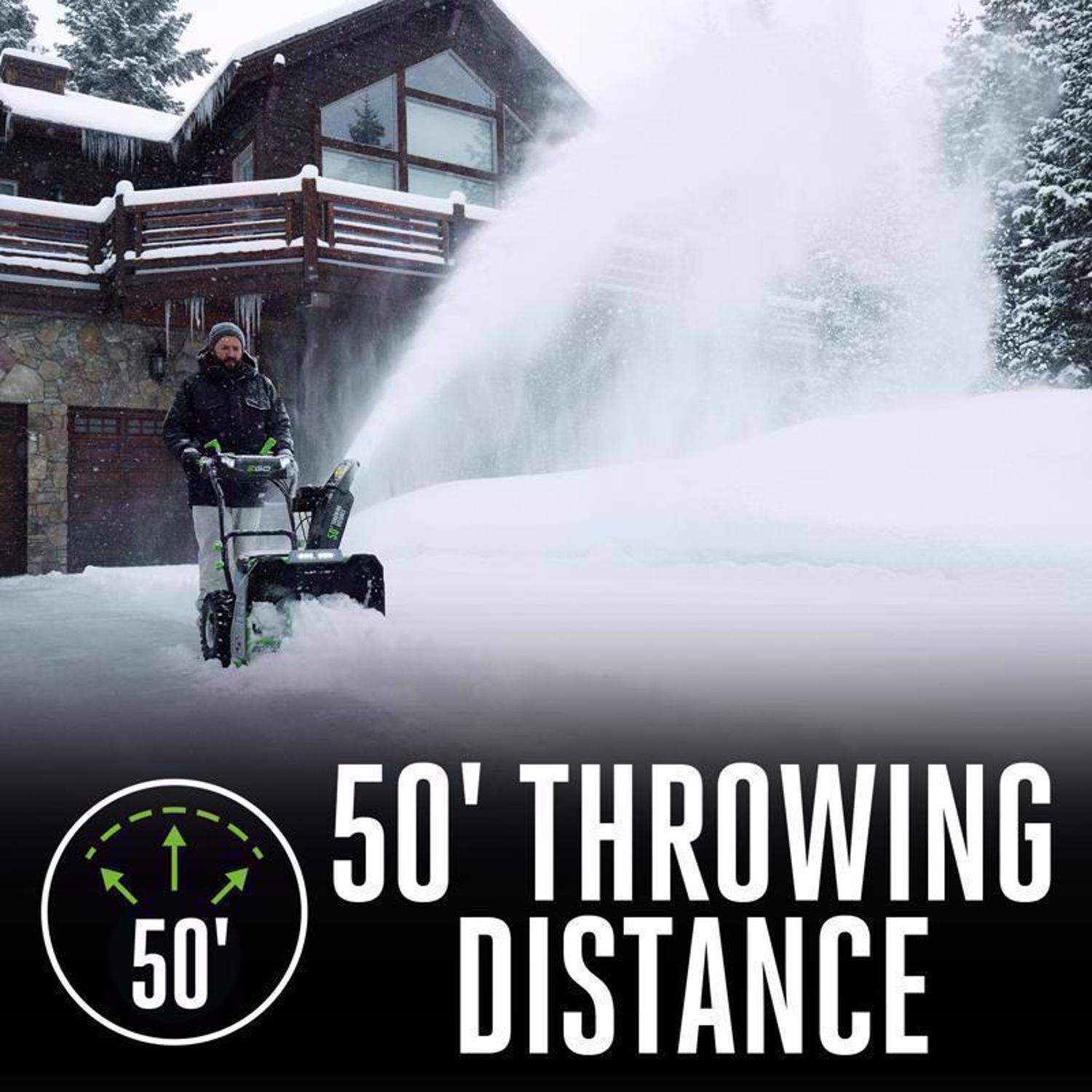 The EGO POWER+ Cordless 2-Stage Snow Blower exceeds the power and performance of gas-powered snow blowers without the noise, fuss, and fumes. Featuring Peak Power technology, this cordless electric snow blower combines the power of any two EGO 56V ARC Lithium batteries to tackle the toughest snow conditions and what the snowplow leaves behind with ease and throws it up to 50 feet. Its 24-inch clearing width and 20-inch intake height handles even the deepest snow, and its variable-speed auger and 200-degree chute direction give you complete control to throw snow where you need it. Get the job done easily with variable-speed self-propelled forward and reverse directions along with four LED lights for added visibility in early morning or evening. Clear 8 inches of snow from a 18-car driveway with the two included 7.5Ah batteries. Experience Power Beyond Belief with the EGO POWER+ 2-Stage Cordless Snow Blower and the entire EGO POWER+ lineup.