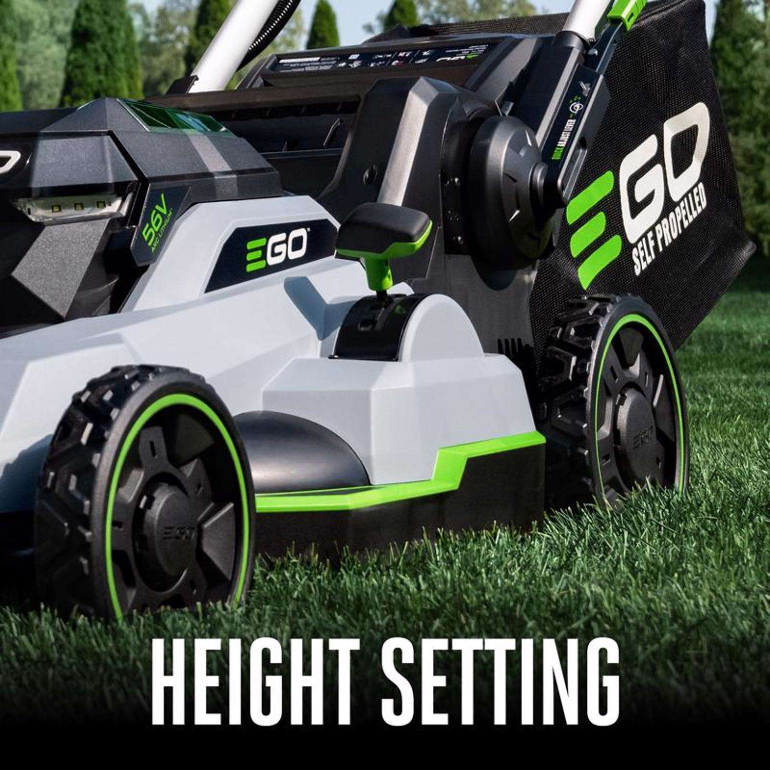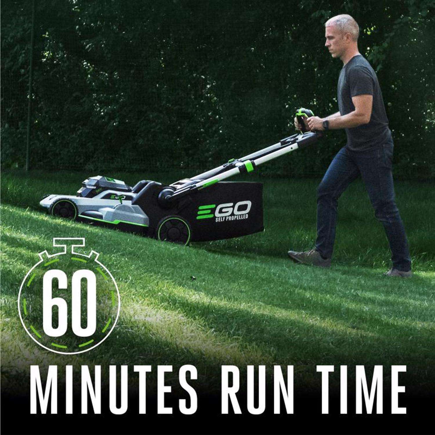 The EGO POWER+ 21-inch Self-Propelled Mower with Touch Drive delivers 6.0 foot-pounds of cutting torque–power that exceeds gas without the noise, fuss, or fumes. Easily control the variable speed with a dial positioned at your fingertips for safe and convenient operation. This cordless lawn mower delivers up to 60 minutes of run time on a single charge with the included 56V ARC Lithium battery. The electric lawn mower delivers precision cutting with its advanced mulching blade and seven cutting height positions from 1.25 to 4 inches, adjustable with one hand. Three-in-one functionality delivers your choice of mulching, side discharge, or bagging your grass clippings; an easy-access two-bushel grass collection bag is included. This self-propelled lawn mower includes bright LED lights for added visibility when mowing at dawn or dusk, and it folds flat for compact storage between cuts. Experience Power Beyond Belief with the EGO POWER+ 21-inch Self-Propelled Lawn Mower with Touch Drive.